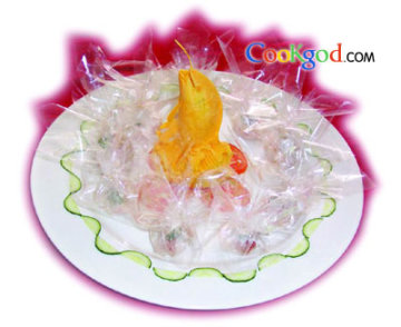 2、玻璃纸摊平,放用淡盐水漂洗过的茉莉花两朵,放上1份鲈鱼片,再放上2克火腿和1克香菜,包拢扎好,入微波炉小火微1分钟即可;照此方法制作9份,装盘即可。