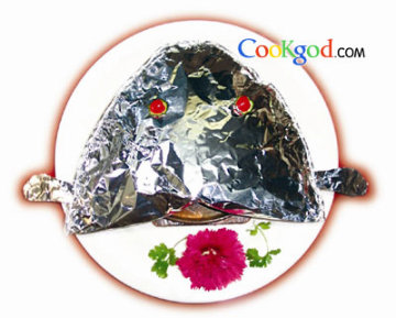 5、铁板连同锡包上中火烧至锡包开始膨胀即转为小火烧至鱼头熟透,锡包鼓成大气泡即成(共计加热为20分钟)。