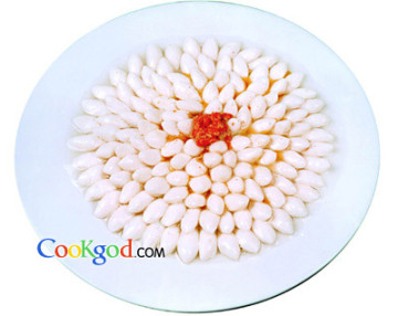 1、将鱼肉剁成蓉,放入容器中,加入盐、味精各3克、生粉、蛋清调味后朝一个方向搅拌上劲,然后挤成橄榄状,放入50℃的温水中小火加热至鱼榄浮起,取出后控水。