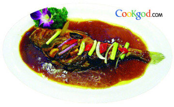 2、将色拉油30克放入油锅内,烧至五成热,放入葱段2克、姜片2克、洋葱2克煸炒出香,然后放入大黄鱼小火煎2分钟,再烹入绍酒4克、盐3克、番茄沙司、味精、糖、酱油、胡椒粉调味后加入清水350克小火焖6分钟,大火收汁后用湿淀粉勾芡,淋香油装盘。