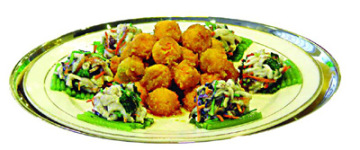 2、把鱼肉丝和胡萝卜丝、香菇丝、香菜段放在碗里加上3克精盐、3克味精、3克白糖、蛋清搅匀,加上干淀粉后团成球状,放入锅中上笼大火蒸5分钟,取出摆在盘子四周。