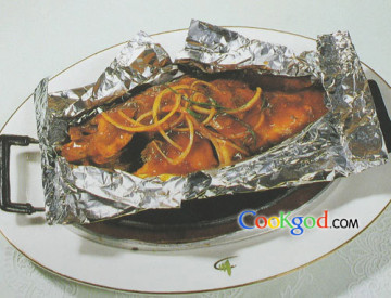 1、鲈鱼宰杀洗净,入油炸至金黄。洋葱切丝。铁板烧热,放上锡纸包,铺上洋葱丝。