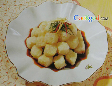 2、将腌渍好的银鳕鱼拍粉,炸成淡黄色。装盘后淋入调料,撒上各丝料。