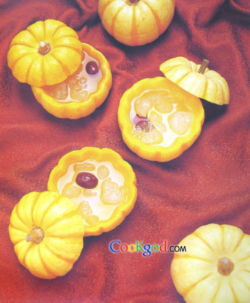 1、小南瓜取盖,去净瓜瓤,汆水;