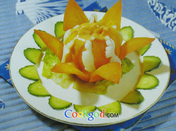 3、黄瓜片围边,生菜叶垫底,放上番茄花,把墨鱼丝放在番茄中心,再浇上自制的沙司即成。