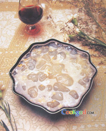 2.将炒锅置中火上,下熟猪油25克,烧至五成热,投入葱、姜末和蟹粉煸炒,稍后,烹入绍酒15克加进高级清汤和精盐少许,稍烧盛起。