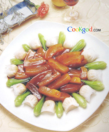 鱼片玉白鲜嫩,佛手瓜翠黄味香。