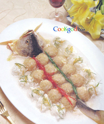 2、鱼身取净肉切丝,将上述配料加入,入味上劲,做成丸子,滚上干贝丝,码于盘中间,上笼用旺火蒸熟取出,浇上汁。