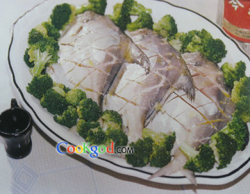 4、入蒸锅内蒸制熟透取出,拣出葱段、姜片不用。另将锅内放入花生油烧沸,舀出二分之一浇在盘内晶鱼上。锅内下入西蓝花.加入余下的料酒、精盐,炒匀至熟,加入味精炒匀,出锅围在盘内晶鱼周围即成。