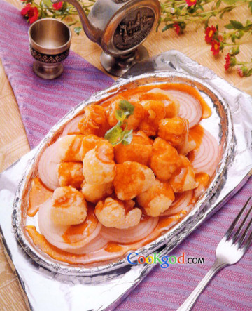 3、铁板烧热,抹上牛油,铺上洋葱圆片,放人炸好的鳕鱼丁,淋上沙茶酱即可。
