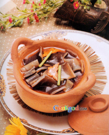 3、把杜仲汁和蒸透的鱼唇一起放人砂锅中,加老抽、冰糖、味精、上汤、固本药酒等焖5分钟,勾芡,淋上鸡油即可。