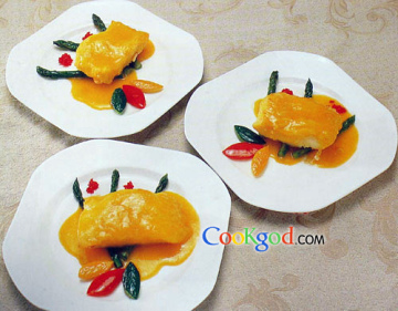 2、芦笋、胡萝卜、用黄油炒制成熟,装点在鱼块旁,浇入浓汤与金瓜汁即成。
