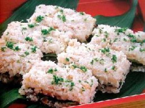 5、最上层铺上蟹肉,加盖压紧,用刀切成小块,撒上葱花