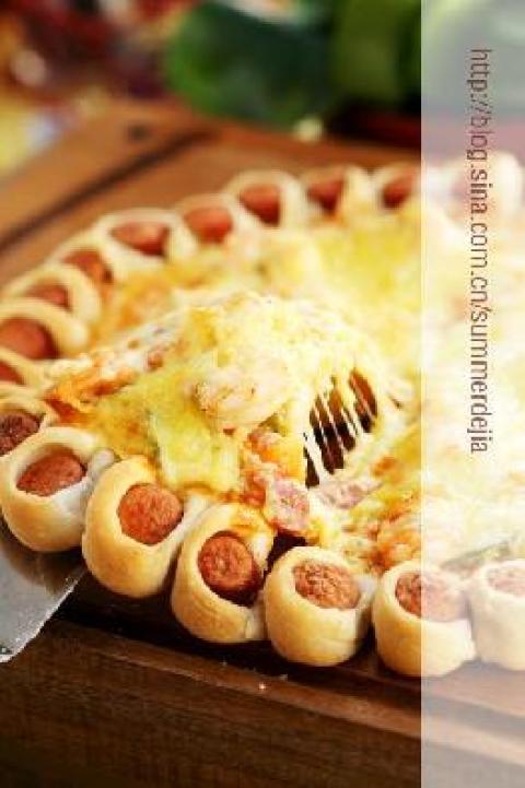 取酥皮面团一小块。(酥皮面团的制作请看这里,003用的就是我制作牛角酥剩下的酥皮:可爱版丹麦牛角酥——巴巴爸爸的一家 )把酥皮面团擀成圆形的面皮,将牛角酥模具压在面皮上,每个凹槽里放一截火腿肠,撤走模具后,面皮自然被分成一个个扇型,将每个扇形面皮折下来包住香肠,然后依次向左扭,将香肠切面转向上。最后,把这些香肠卷放在披萨饼皮上面,用鸡蛋液黏住。