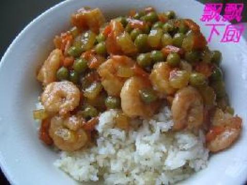 料酒,生粉,盐,生抽,番茄沙司3大匙,糖1大勺,胡萝卜,西芹丁,豌豆,虾仁