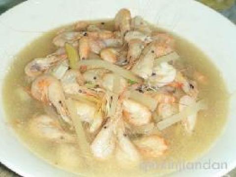 (不可久煮)此菜汤清虾白,做法简单,以醪糟取代料酒,一来保持汤色清澈,二来在原来的咸鲜味中带点可以回味的甘甜,增加香味,算是对本地农家菜的一点创新吧。