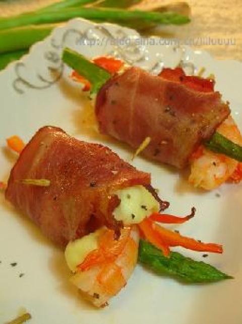 第一种:海鲜菜谱鲜虾芝士培根卷做法