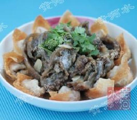 6.馄饨摆在盘中,倒入酸辣海参即可