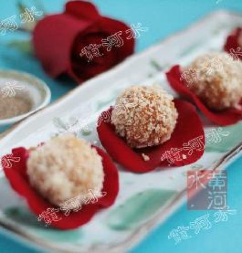 鲜虾,鸡脯肉,肥膘,鸡蛋,玫瑰花瓣,面包糠,盐,料酒,鸡精,胡椒粉,葱,姜,香油
