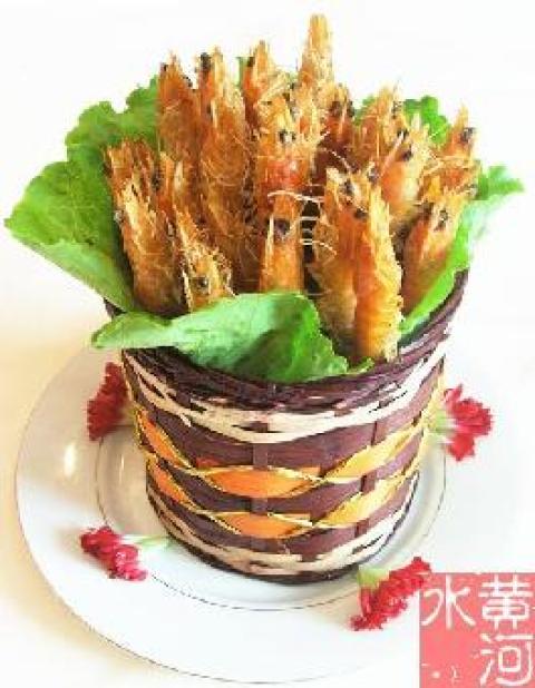 虾去头开背,用竹签串好,过油,再将其他料烧制好,淋在炸好的虾上即可。