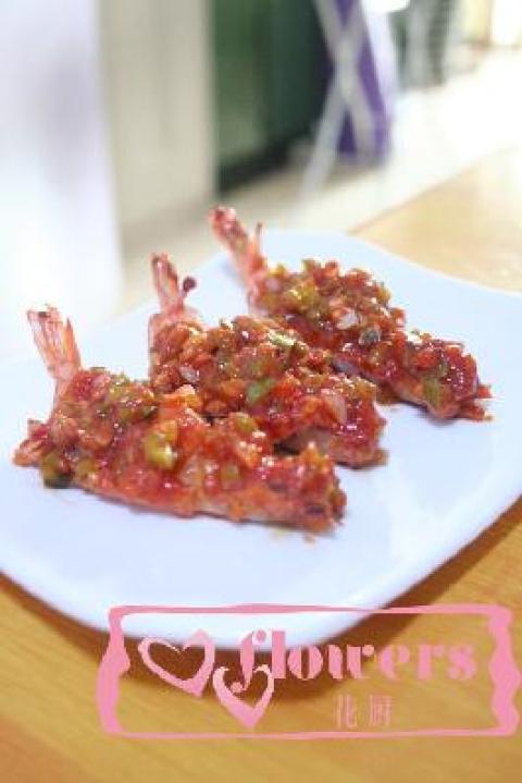 3.泰式甜辣酱1份、韩式辣酱有份、番茄酱0.5份和番茄沙司0.5份混合均匀后备用。热锅倒油,将码好味的虾去除姜丝和葱丝再加入放少许干粉和面包糠拌匀后入七成热的锅中煎至两面金黄盛盘备用。 锅中留入少许底油,放入调好的酱汁炒出香味后加入尖椒和黄瓜丁,炒匀后倒入刚刚煎好的虾上即可。