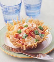 1、将大虾去头去壳,留虾尾。香菇切小丁。马铃薯去皮切成丝,洗净沥干水分,用精盐1克、干淀粉20克、面粉拌匀,铺在漏勺内成燕窝状,下入七成热油中炸至上色定型捞出,放入盘的一侧。