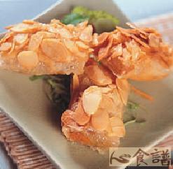 4.将包好的威化捲涂上少许蛋液,沾上杏仁片。