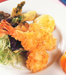 明虾2尾,西生菜100公克,茄子100公克,芦笋2根,鲜香菇1朵,面粉适量,面包粉适量,a.柴鱼片少许,水80㏄,酱油1大匙,糖1小匙,酒1小匙,b.低筋面粉200公克,水400㏄,蛋黄1个,玉米粉2大匙