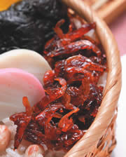 2.将樱花虾洗净沥干,与甘味煮汁一起以小火熬煮至收汁即可。