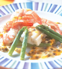 4.取一大盘,将作法2的芦笋先铺于盘底,再将作法3的山药丝放上,最后摆上虾、淋上百香果酱汁即可。