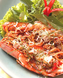 大明虾2只,柠檬叶4片,红葱头适量,生辣椒适量,香菜适量,鱼露1大匙,柠檬汁1匙,辣椒膏1小匙