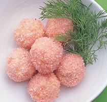 2.将作法1的虾浆分成15等份,沾上玉米粉,沾裹蛋液,再沾上米果,揉成圆球型,并将米果轻轻压紧使其不易掉落。