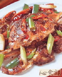 2,把姜葱辣椒放入油锅爆炒加少许盐和酱油,待办成熟时,再放入花蟹一起爆炒,加少许鸡精起锅!