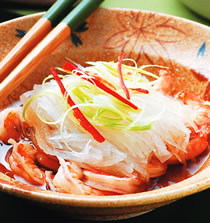 2.将作法1的白萝卜丝与辣椒丝排放于虾仁上,再将调味料a调匀后淋上。