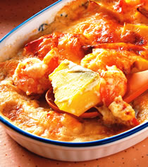 3.将作法1的酪梨片、奶油白酱、高汤放入作法2的锅中,续以小火拌炒均匀,再倒入烤盘中,铺上一层起司丝,即为半成品的焗烤酪梨鲜虾。
