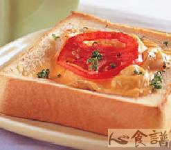 3.将作法2的虾料铺在厚片土司上,再叠上起士片,放进烤箱以180℃烤约3分钟,取出后铺上生菜、蕃茄片即完成。