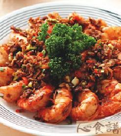 4.下油二汤匙,爆香蒜茸、川椒粉,下虾,浇酒一茶匙炒匀,洒下葱花即可上碟。