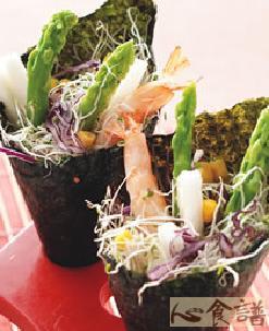 4.取一片海苔置于手心,依序放上综合蔬菜、作法3的鲜虾1只、作法2的籚笋2支,再挤入美乃滋,顺势垂直包裹捲起呈倒三角锥状,即为鲜虾芦笋手捲(此材料份量可包2份)。