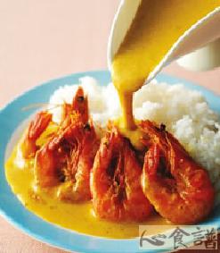 草虾10只,洋葱1/2个,沙拉油3大匙,椰奶250㏄,水100㏄,香米白饭1碗,黄姜粉1茶匙,盐1/2茶匙,细砂糖1/4茶匙