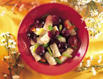 (2)再将芹菜、青椒、红萝卜、葡萄等洗净一併切好备用,葡萄由尾部切十字刀法,不可切断,并去除籽备用。
