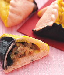 墨鱼面糰80公克,红麴面糰80公克,南瓜面糰80公克,内馅:100公克,虾仁50公克,海蔘50公克,花枝50公克,皮冻50公克,细砂糖1.5公克,鸡粉1.5公克,胡椒粉少许,香油1/4小匙,米酒1/4小匙