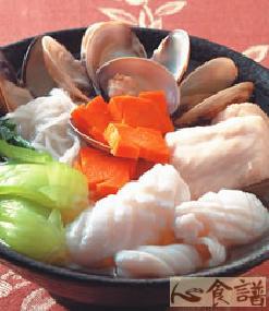 透抽60公克,鲷鱼片60公克,蛤蜊5颗,青江菜3颗,红萝卜片20公克,米粉半包,高汤300㏄,蛤蜊水3大匙,盐1/2茶匙