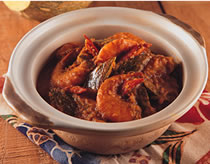 (2)起油锅,加入1大匙沙拉油,将材料2炒香,再加入调味料,煮沸后倒入砂锅内,把南瓜块放入,用小火慢慢焖煮,等南瓜熟后,再加入草虾煮熟即完成。