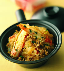 2.)起油锅爆香蒜末、葱花,依序放入绞肉炒至8分熟,再加入调味料(2)及冬粉拌炒,待煮沸后移至砂锅上,放入切好的霸王蟹蟹脚,加盖改中火续煮3∼5分钟,最后再以小火烧至汤汁收干即可。