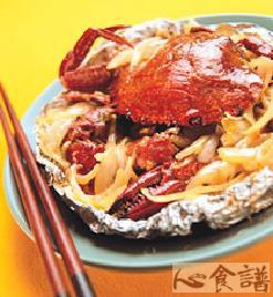 (3)将红蟹排在铝箔纸上,铺上洋葱丝,加入适量的盐,将铝箔纸包起后放入烤箱,烤箱温度设定为200℃,烤约15分钟左右即可。