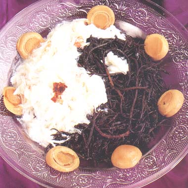 3.把蟹肉及蟹膏加水加生粉煮成芡汁,起锅前将蛋白倒入搅匀,收火后与海草同上碟即成。蘑菇片伴碟。