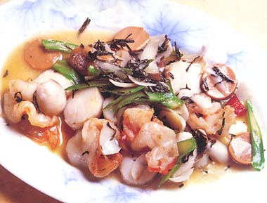 第一种:海鲜菜谱龙井泡虾球带子做法