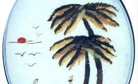 2.将海参150克用斜刀片成椰子树叶形,共16片,边上用立刀刻成花边(以便定形),再片6片做树干;