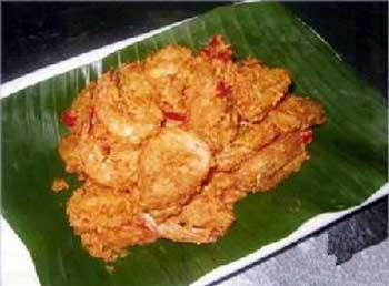 1、剪去罗氏虾的虾须,虾身纵分为二,洗净晾干后,放入油锅炸至金黄色,捞起待用;