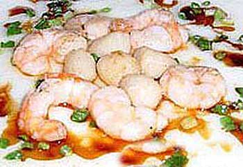 取出撒葱花,浇适量滚油,把腌好味的虾仁、带子用油泡熟,覆盖表面即成,吃时可加入少许生抽以增鲜味
